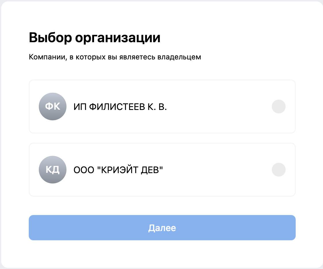 После авторизации на Госуслугах вы увидите окно выбора организации — укажите нужную организацию. В этом окне отображаются только те организации, ИНН которых на Госуслугах совпадает с ИНН в профиле платформы MAX для партнёров